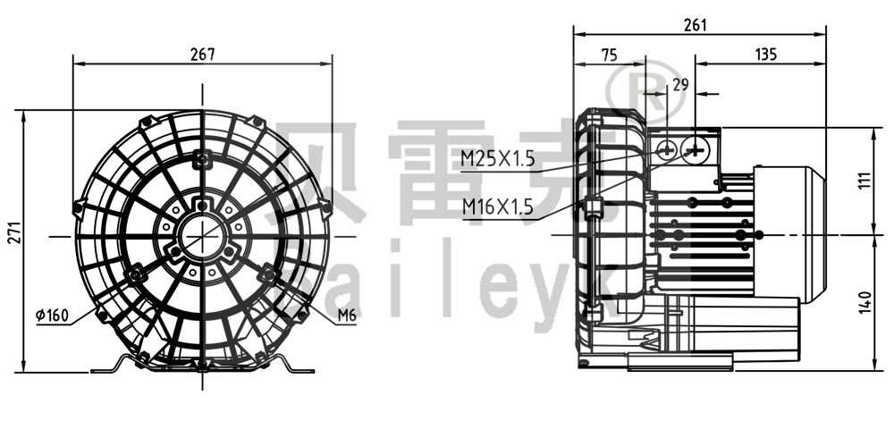 最大風(fēng)量:100m3/h 最大正壓:150mbar 最大負(fù)壓:150mbar 防護(hù)等級:IP55 噪音:55db 重量:12Kg